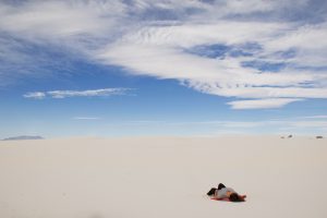 Im Anschluss anElPaso sind wir zu dem White Sands National Monument gefahren, was WIRKLICH ein Trip wert ist. Wir kennen das alle, wir sehen Bilder von irgendeinem Ort, sagen wir mal Dünen und es sieht richtig schön aus. Sandso weitdas Auge reicht, keine Touristen / Menschenmassen, nur die Leute, die auf den Bildern ist. Dann fährt man dorthin und alles ist anders. Nur Touristen und um ein vernünftiges Bild zu bekommen, muss man entweder Photoshop Profi sein oder „den perfekten Moment“ abpassen und braucht dafür vermutlich den ganzen Tag. Hier ist das allerdings etwas anderes. Auf dem Wegdorthin haben wir uns allen Enttäuschungen vorbereitet, denn die Straße ist ewig lange und einfach nur geradeaus, rechts und links trockenes Gebüsch und am Ende stehen dann Berge. Ganz hinten hatte man das Gefühl eine Art Nebel zu sehen, bzw. ein weißerSchleierkurzoberhalbder Straße, was hätte Sand sein können. Naja, nachdem wir dann fast fest davonausgegangensind, dass es wieder ein Ort sein würde, wie ich ihn oben beschrieben habe, kamdann irgendwann weißer Sand zum Vorschein. Nachdem der eigentliche Park geschlossen war (wegen der Politik), sind wir nochmal etwa 3 Kilometer zurückgefahren, da wir auf dem Hinweg schon einige parkende Autos dort gesehen haben. Wie sich dann rausstellte, sind die Sanddünen dort über dem Zaun, man läuft also 10 Meter auf die Sanddüne und somit ist man automatisch „drinnen“. Dort beginnt dann eigentlich auch schon eine wunderschöne Sandlandschaft ganz in weiß. Natürlich waren auch Touristen (allerdings nicht viele, wahrscheinlich weil es auch nicht der richtige Eingang ist), aber man hatte mehrere Möglichkeiten schöne Bilder zu fotografieren. Dieser Ort hat so eine Ruhe und Gelassenheit ausgestrahlt, wie selten ein Anderer.