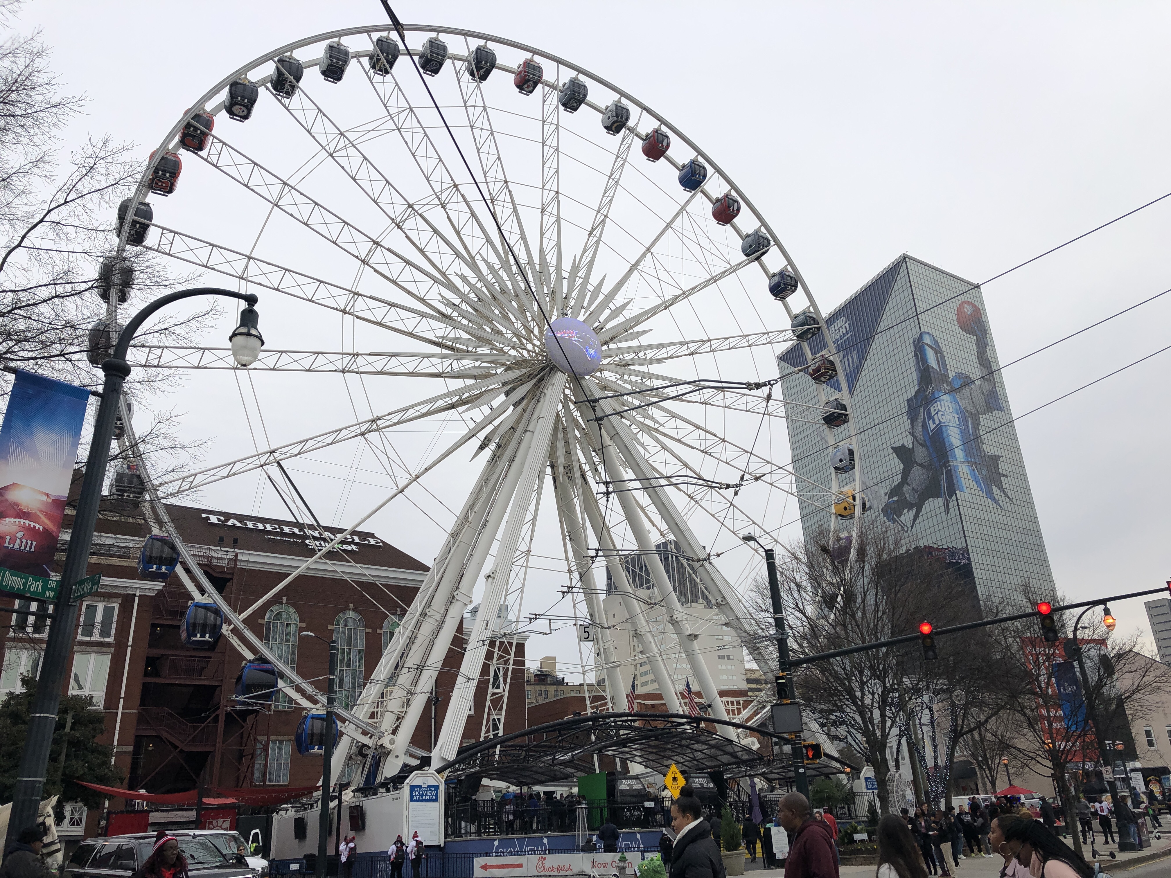 InAtlanta waren wir wirklich einfach zur richtigen Zeit am richtigen Ort. Wer „American Football“ etwas verfolgt, weiß dass am kommenden Wochenende DAS EVENT des Jahres steigt und diesmal in Atlanta, Georgia ausgerichtet wird. DER SUPER BOWL.Man merkt der Stadt richtig an, dass die Menschen sich freuen, alles wird vorbereitet, die Straßen werden umgeleitet, die Stadt ist voller Leute, ein Riesenrad ist aufgebaut, die Gebäude sind geschmückt, jeder ist gespannt… Das war einfach mal schön die Vorbereitung von so einem Event live miterleben zu können. Ansonsten scheint Atlanta aber recht ruhig zu sein… auch wenn der Flughafen, als der „geschäftigste“ weltweit gilt.